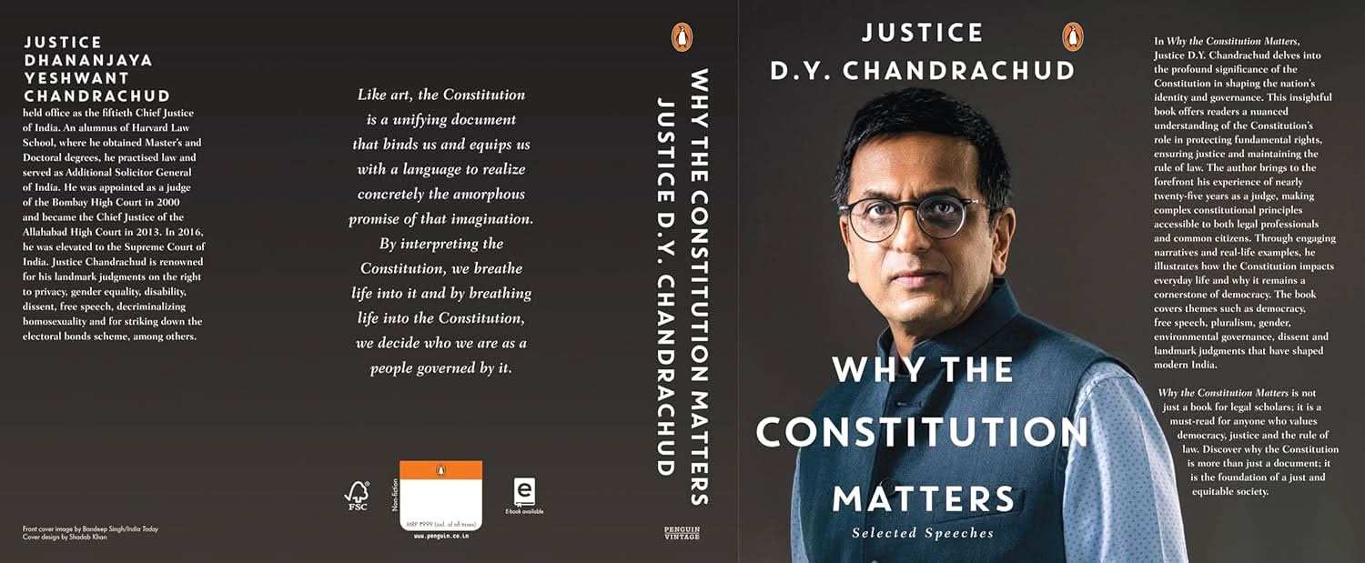 InΒ Why The Constitution Matters Justice D.Y. Chandrachud delves into the profound significance of the Constitution in shaping the nationβs identity and governance. This insightful book offers readers a nuanced understanding of the Constitutionβs role in protecting fundamental rights, ensuring justice and maintaining the rule of law. The author brings to the forefront his experience of nearly twenty-five years as a judge, making complex constitutional principles accessible to both legal professionals and common citizens. Through engaging narratives and real-life examples, he illustrates how the Constitution impacts everyday life and why it remains a cornerstone of democracy. The book covers themes such as democracy, free speech, pluralism, gender, environmental governance, dissent and landmark judgments that have shaped modern India.